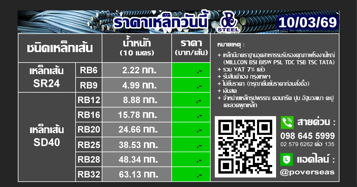 #เหล็กมีมาตราฐานอุตสาหกรรมรับรองคุณภาพโรงงานใหญ่ (MILLCON BSI BISW PSL TDC TSB TSC TATA) #รวม VAT 7% แล้ว #รับสินค้าเอง กรุงเทพฯ #ไม่ยืนราคา (กรุณายืนยันราคาก่อนสั่งซื้อ) #เงินสด #จำหน่ายเหล็กรูปพรรณ คอนกรีต ปูน อิฐมวลเบา ตะปู และลวดผูกเหล็ก